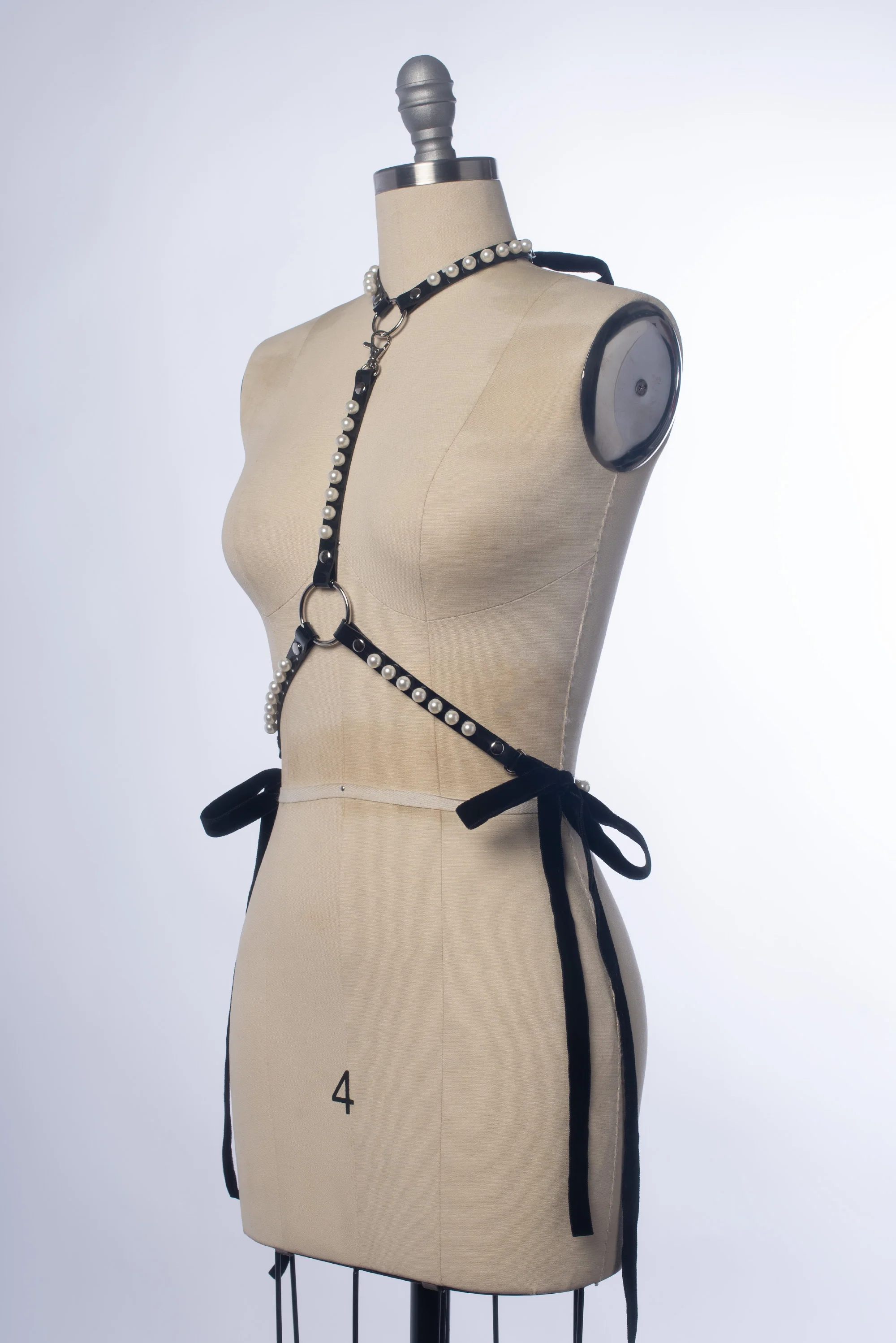 This dreamy harness is a confection of black velvet and pearls, paired with black PVC for some edge. Features three-dimensional pearl rivets in a warm soft white tone, luxe double-faced velvet ribbon, silver-tone hardware, all on a black PVC base. Perfect for an elevated gothic doll look.