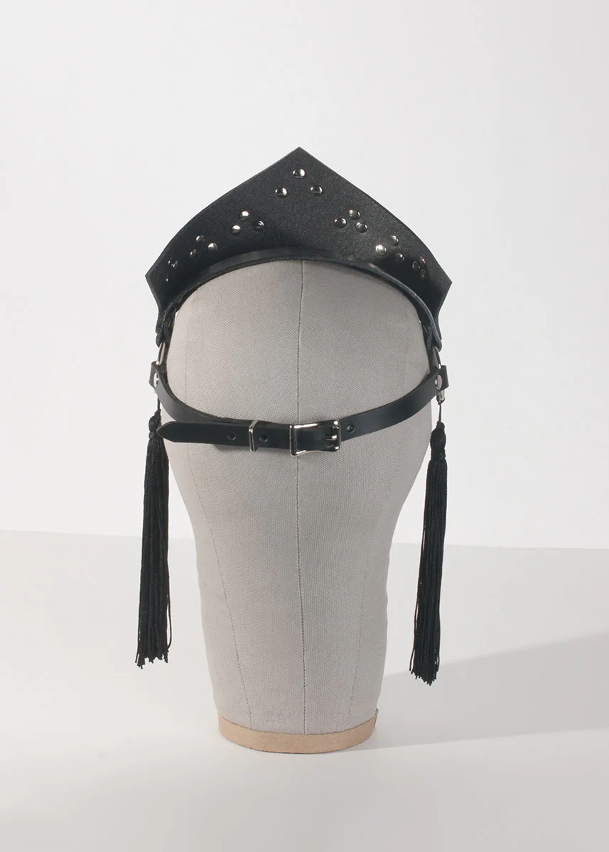 Gorgeous harness crown headpiece withĀ silver leather cutouts, studded/riveted details, and tassels. Ā Fastens in back with buckle.