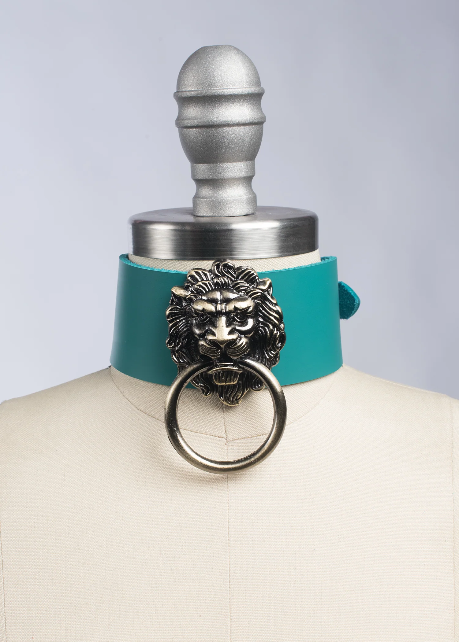Sultry collar in colorful leather or PVC with a beautiful, x-large lion head pull ring adornment on the front. Â Fastens in back with buckle. Â Antique gold toned hardware.
