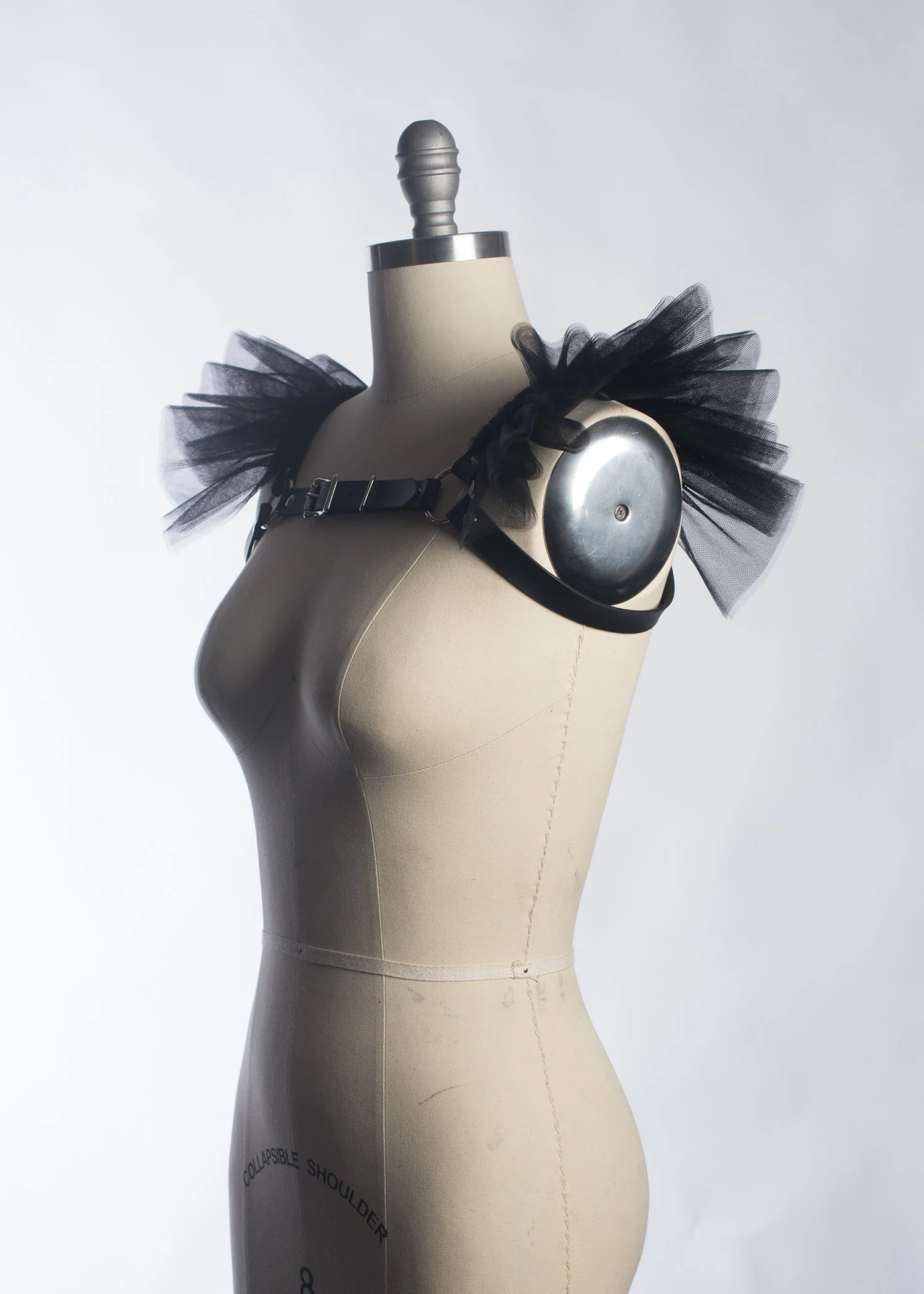 The Giselle Ruffle Sleeve Harness top is a classic chest harness updated with full and flouncy tulle ruffle sleeves. Silver toned nickel plated steel hardware. Fit is adjustable at chest. Designed to fit above the bust/chest.