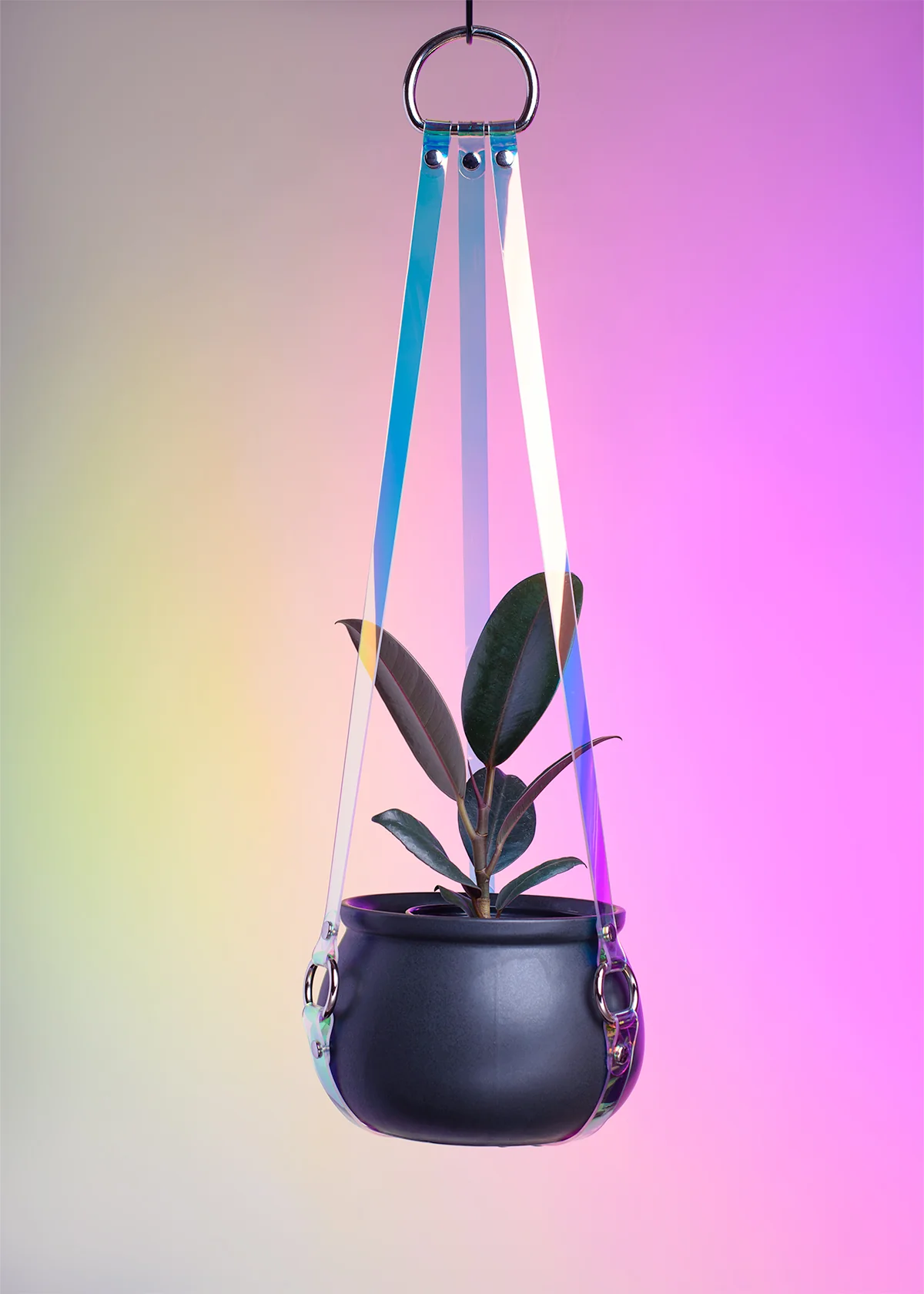 This plant hanger is designed with harness aesthetics, yet is still simple and sleek enough to let the plant steal the show. Iridescent, holographic 2mm thick PVC in "blue" has aĀ cool color shift and adds a lovely, prismatic touch to any room.Ā