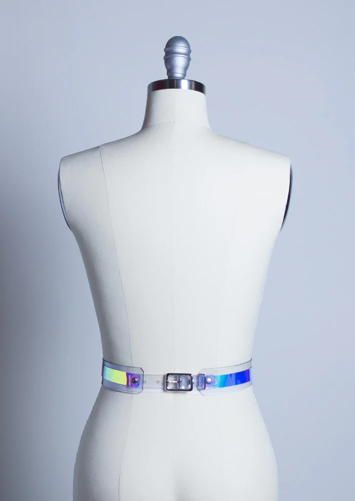 Magical, transparentĀ belt in thick PVC. Holographic, iridescentĀ PVCis layered over clear. Ā Oversized yet delicate o-ring detail in front. Ā Fit is adjustable with buckle in back. Made to fit at the natural true waist.