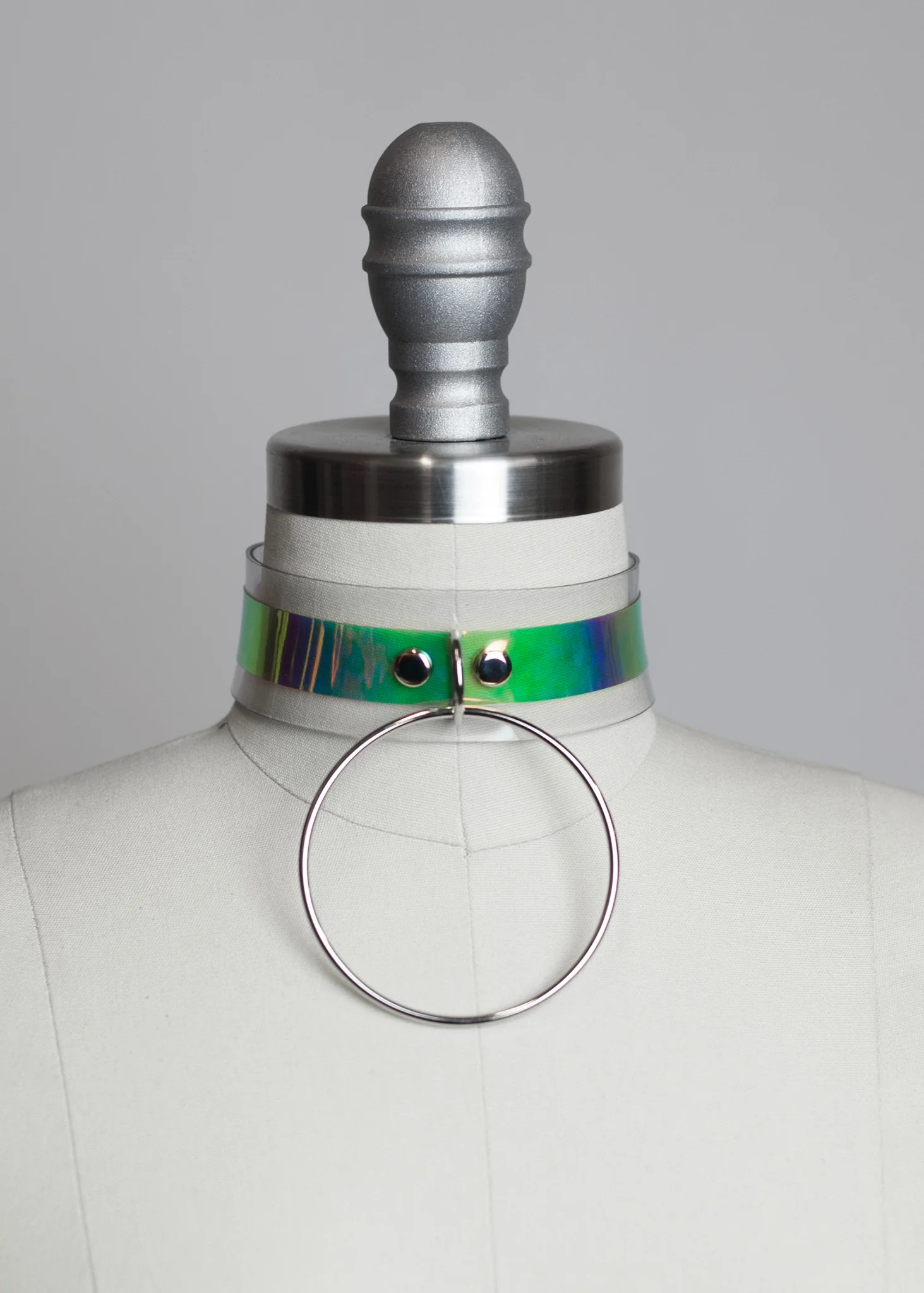 Magical, playful choker collar made in thick PVC. Holographic, iridescentĀ PVC is layered over clear. Ā Large but delicate 3" o-ring detail in front. Ā Silver toned nickel plated steel hardware. Ā Fit is adjustable with buckle.