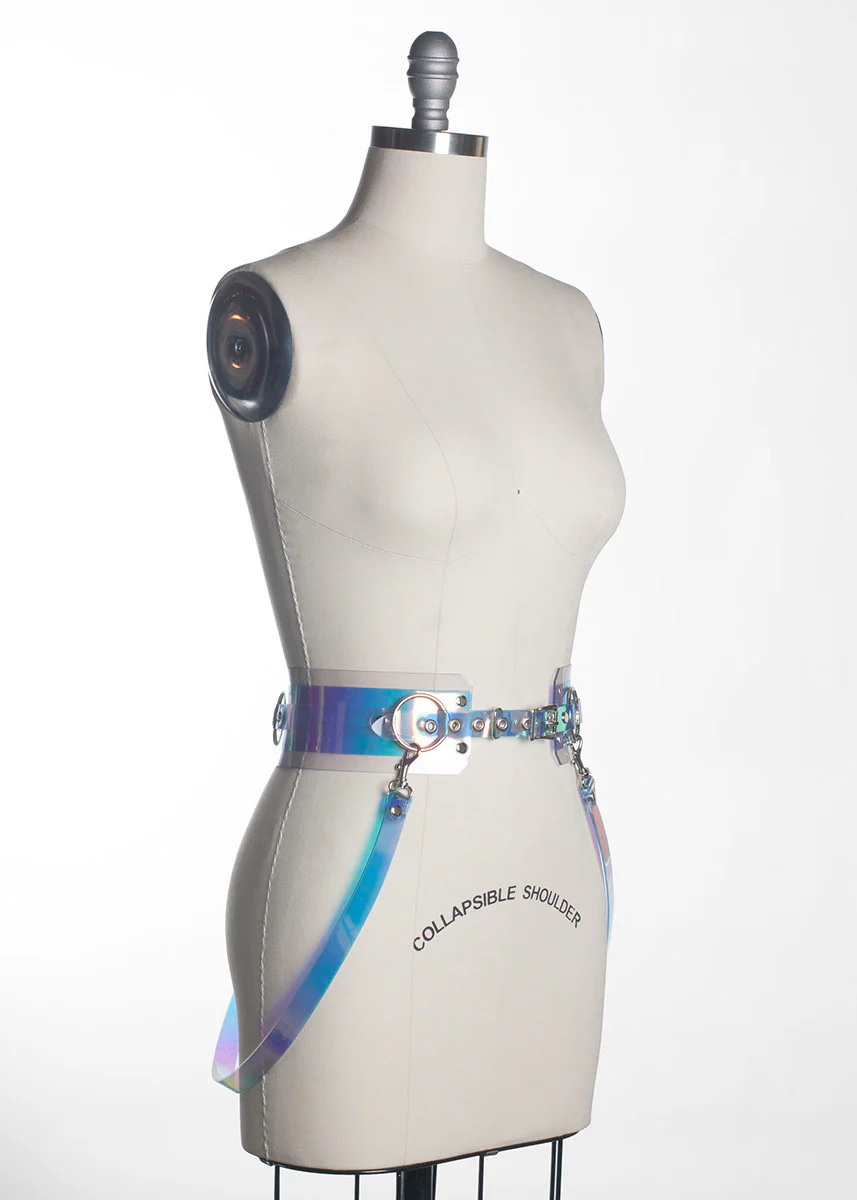 Statement-making harness belt inĀ holographic, iridescent PVC layered over clear turns heads with it's flattering design. Ā "Bondage straps" clip on to the o-rings at the front and back and follow the natural curves of the body. Ā Straps are removable, making this a fun and versatile layering piece.