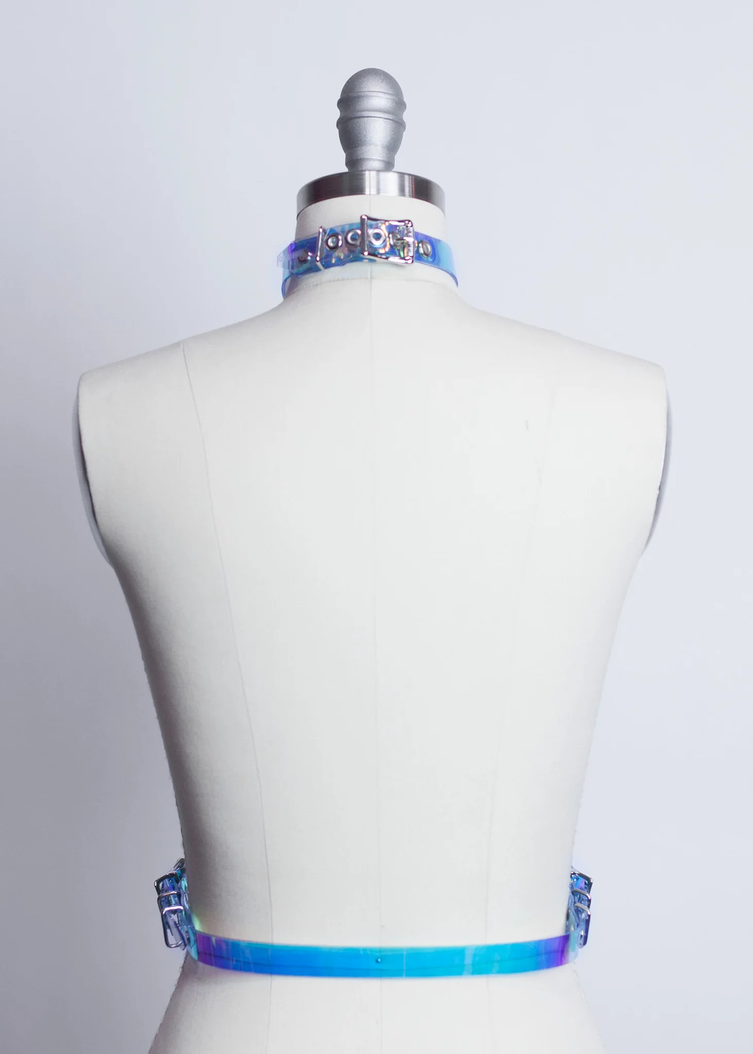 High quality slim harness belt in amazing Ā translucent holographic, iridescent PVC. This material shimmers with all the colors of the rainbow. Over white or light colored fabrics, the colors shift cooler, more magentas and purples. Over dark colors and black, the colors are more vibrant and neon and take on an almost golden rainbow sheen. Either way, it's magical!