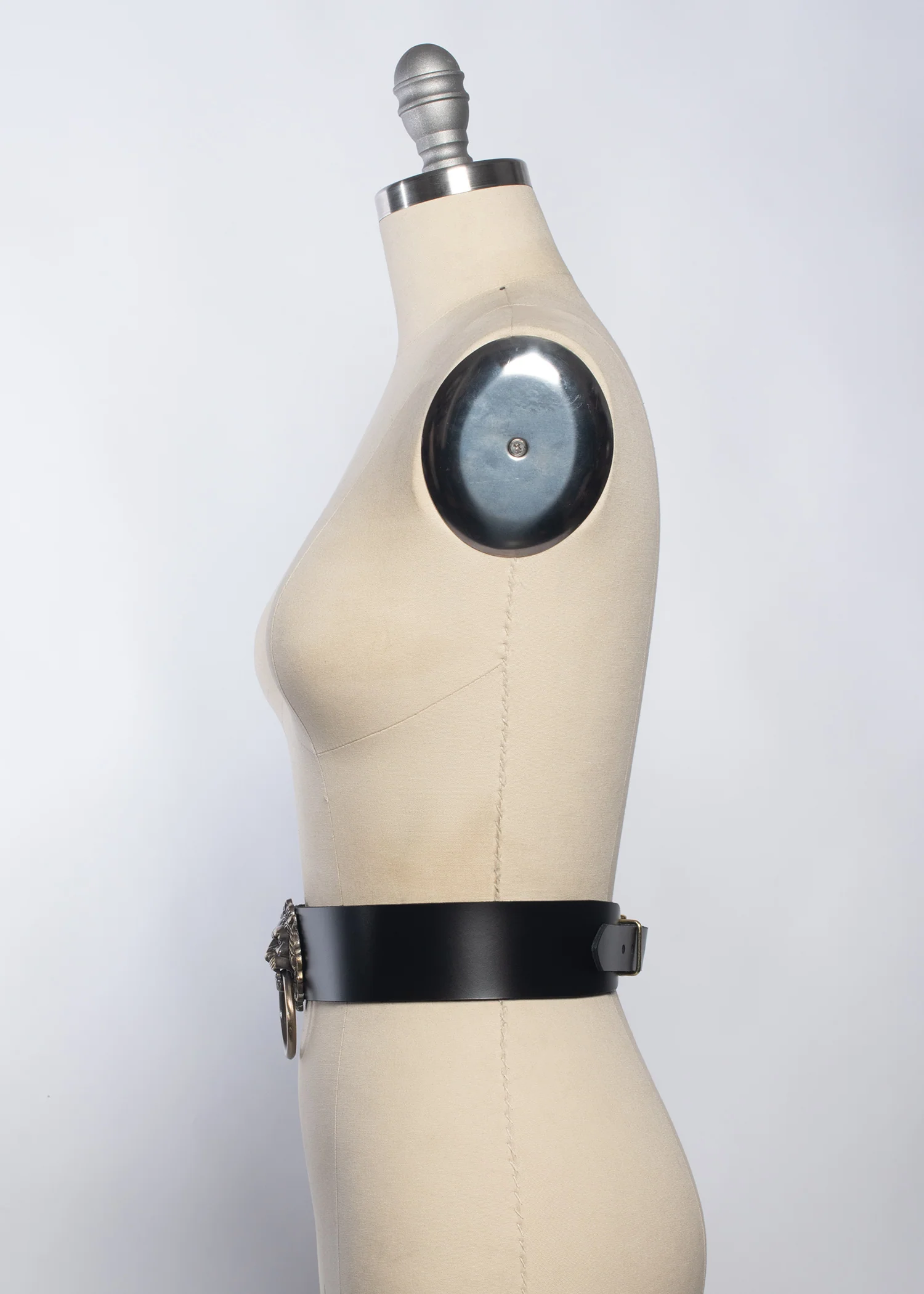 Baroque statement belt with a beautiful, x-large lion head pull ring adornment on the front.  Fastens in back with buckle.  Antique gold toned hardware. Available in leather, vegan leather, or PVC.
