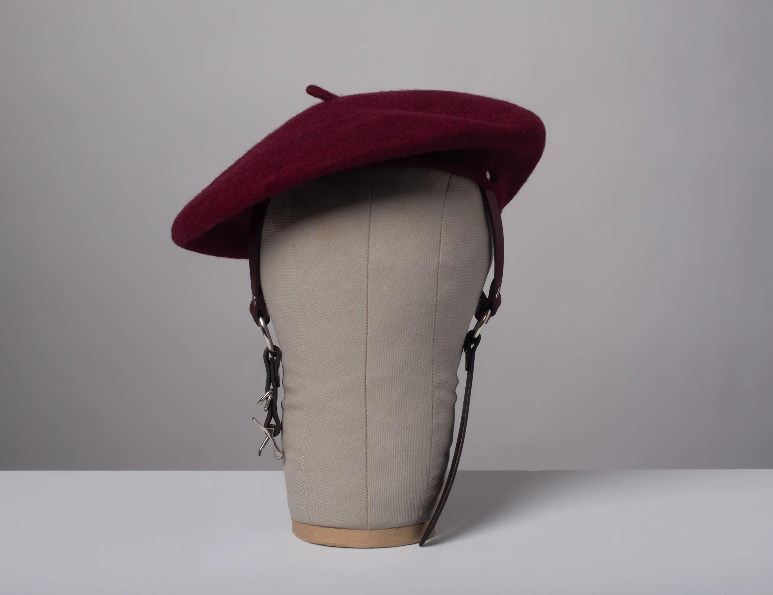 This full-size wool burgundy wine beret hat is outfitted with harness straps that buckle under the chin. Nice and structured, quality woven with a nice tight weave.Â