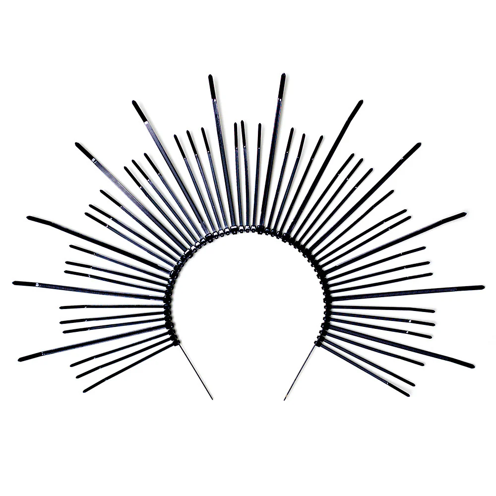 Inspired by classic images of the Virgin Mary in Catholic art and imagery and Dia De Los Muertos, angels, saints, the Mary Crown is a striking spiked headband crown made of hand painted plastic zip ties of even spacing and alternating size on a metal headband. Worn alone or paired with a floral headdress or veil, this avante garde headpiece is a unique statement piece. Available in many colors, including black and gold (shown).
