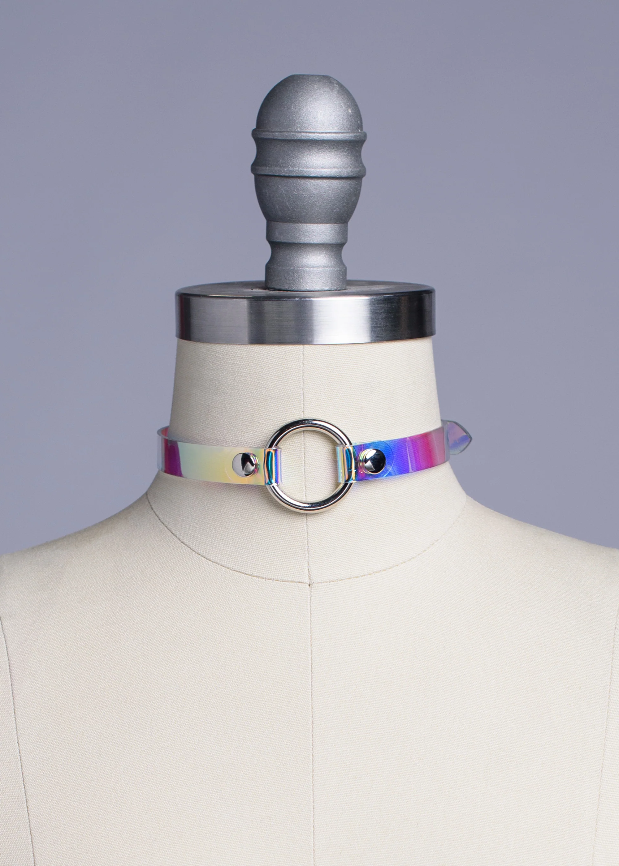 Magical, color-shifting iridescent o-ring choker made in thick PVC. Holographic, iridescentĀ PVC is layered over clear. Ā Fit is adjustable with buckle. Ā Holes reinforced with silver-toned grommets.