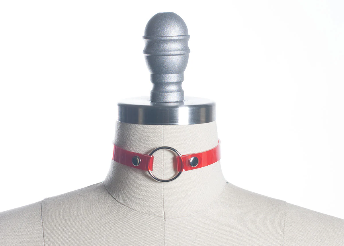 Skinny version of the classic o-ring collar in thick PVC or leather. Fit is adjustable with buckle. Ā