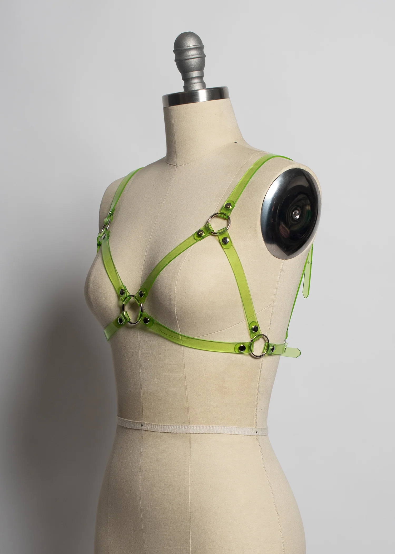 Classic cage bra harness in bright, colorful PVC.Ā Buckles at shoulders and back.Ā Straps can be worn as shown or criss-crossed in back.