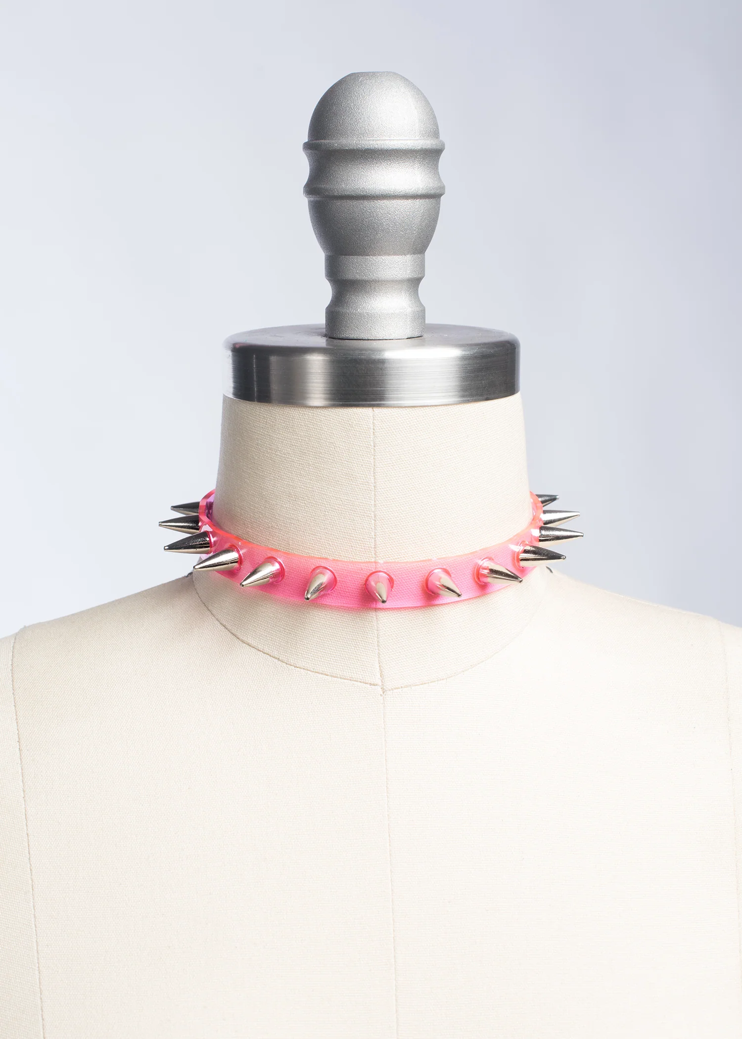 Classic choker collar with a colorful twist. Silver 1/2" spikes riveted evenly throughout. Adjustable buckle inĀ back. Available in PVC, leather, or vegan leather. An essential item for any goth or punk who likes a little bit of color, festival or clubkids-inspired looks.