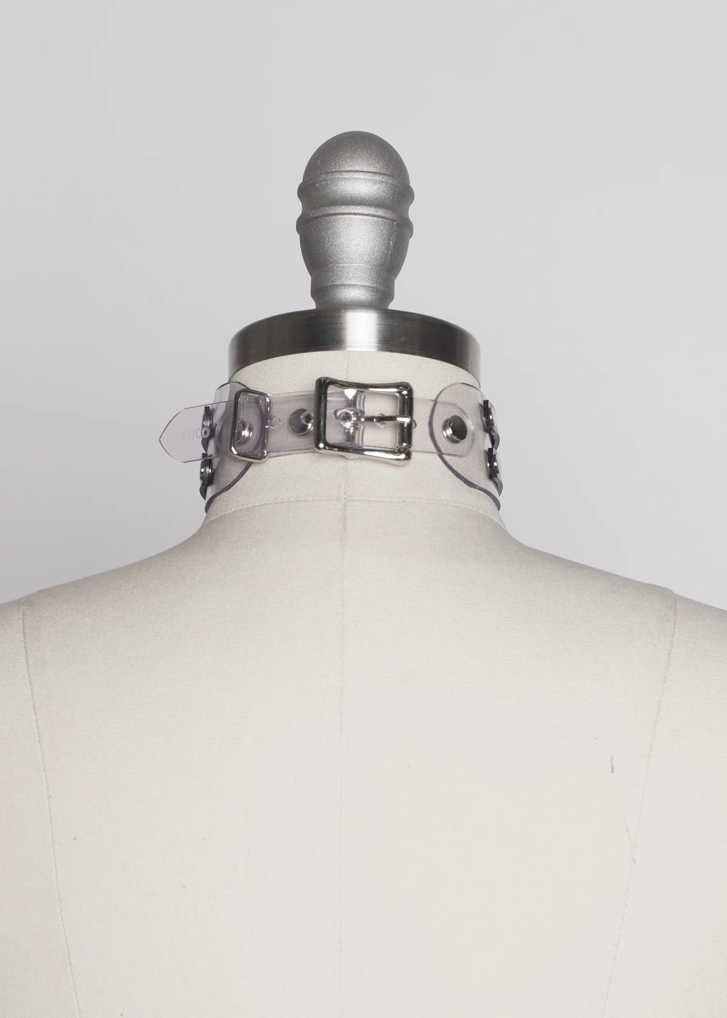 High quality, durable, choker collar made in thick PVC. Two stripes of black PVC is layered over clear. Fit is adjustable with buckle. Silver-toned nickel plated steel hardware.
