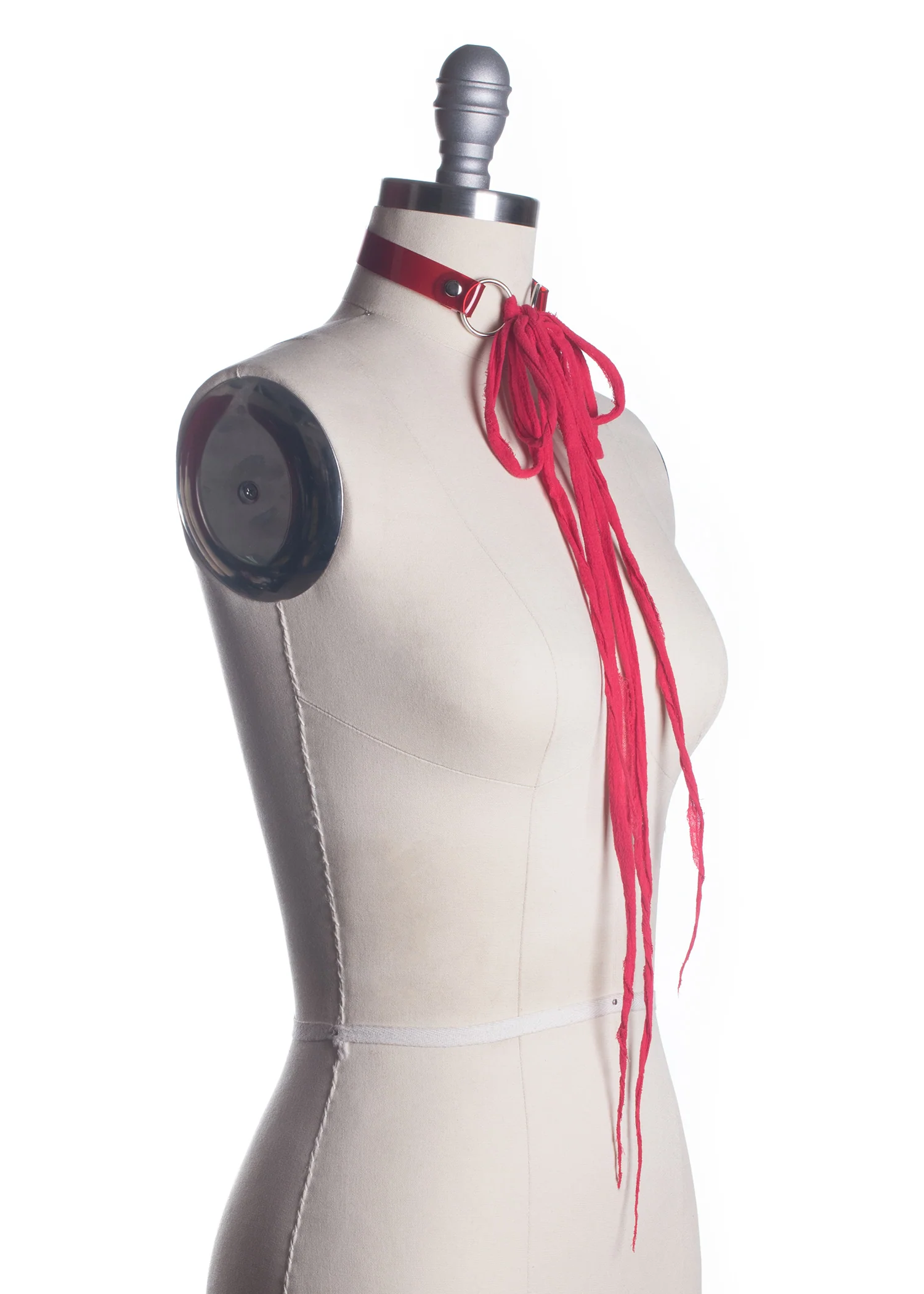 High quality post apocalyptic choker collar made in thick red PVC. Shredded gauze closure. Can be worn tied in a bow for an edgy, gothic doll look. Can be worn many other ways, with the long gauze ties tied in a knot, wrapped around the neck or body, and with the ties in front or back. Silver-toned nickel plated steel hardware.