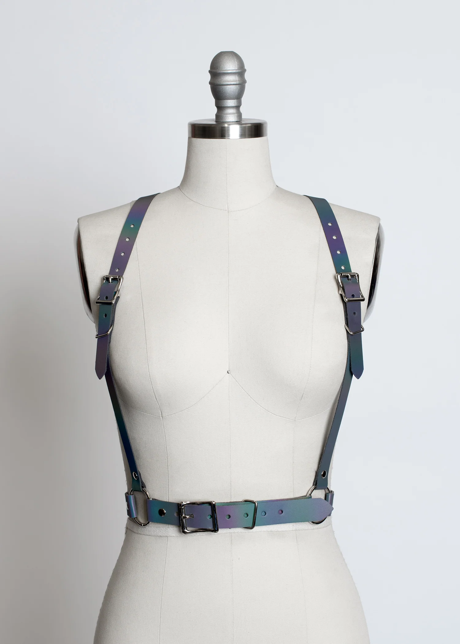 This harness is truly magical and transformative! In regular lighting, this unique, reflective material is a dark gray oilslick with a subtle sheen, but when the light hits it it glows up with a blinding, iridescent neon rainbow. Perfect for club environments and occasions with a lot of flash photography.