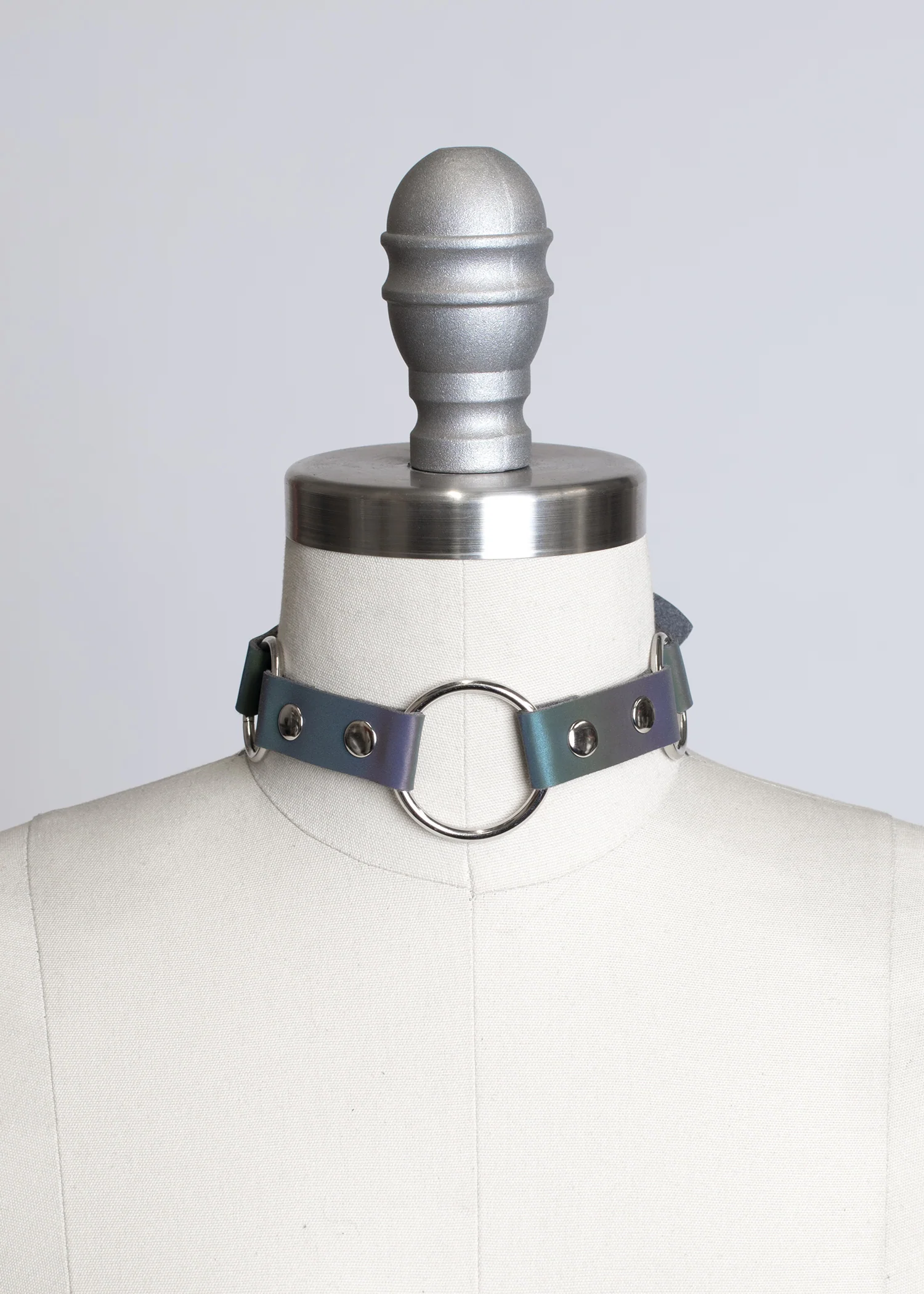 This choker collar is truly magical and transformative! In regular lighting, this unique, reflective material is a dark gray oilslick with a subtle sheen, but when the light hits it it glows up with a blinding, iridescent neon rainbow. Perfect for club environments and occasions with a lot of flash photography.
