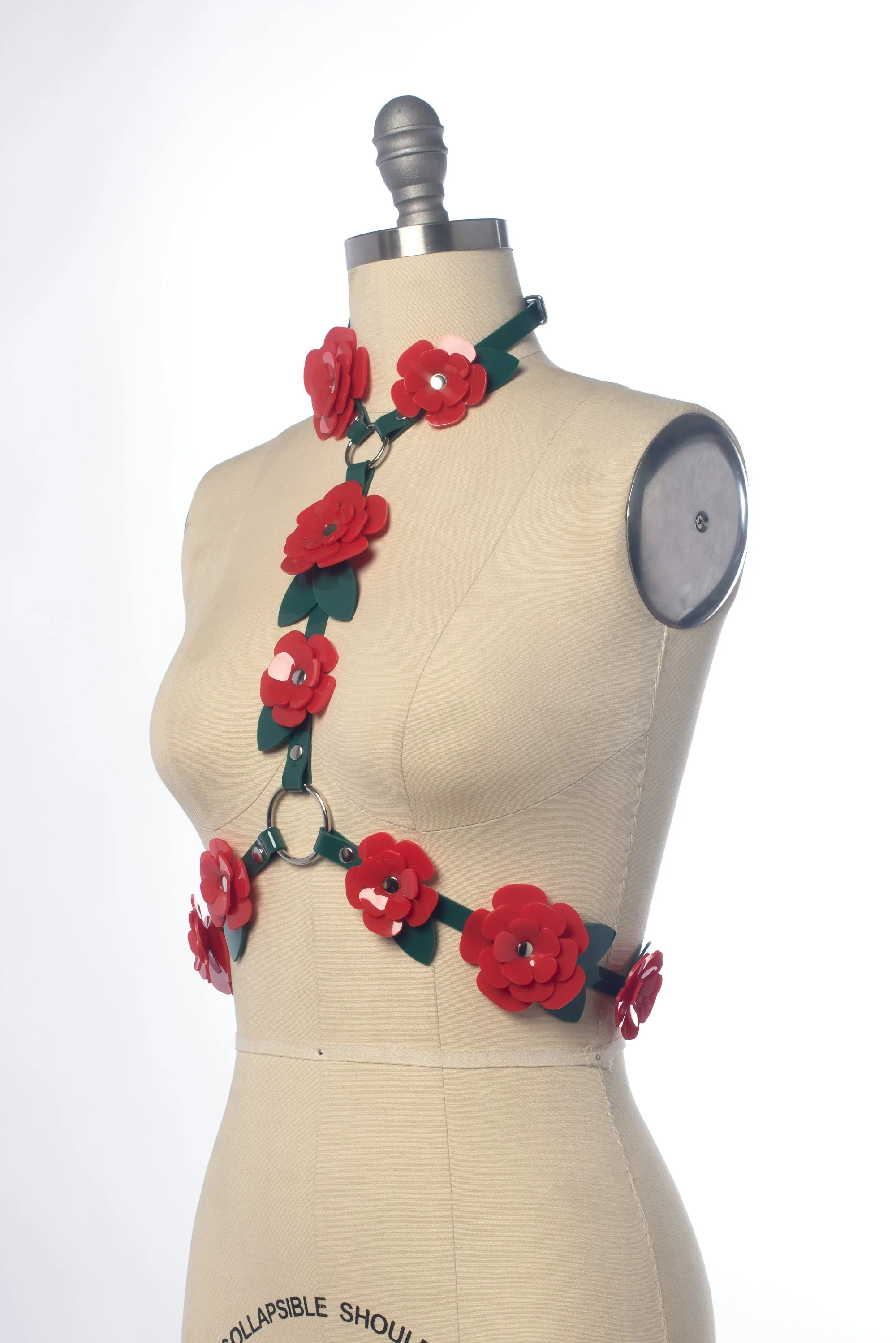 The Rose Red Harness - layered red PVC petals and green leaves adorn a slim green harness base for a look that's opulent and decadent. Buckles at back of neck and back of waist.