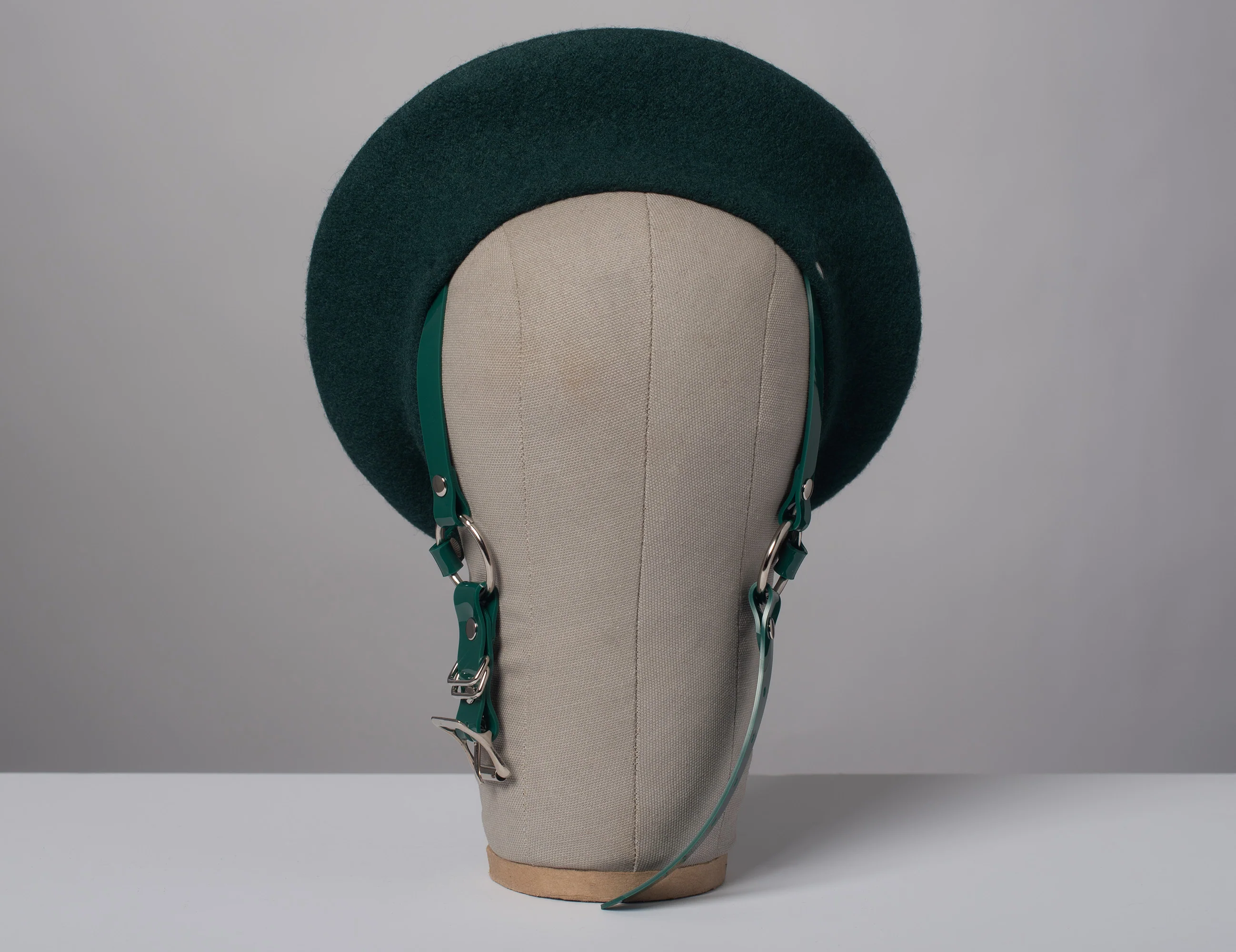 This full-size wool forest green beret hat is outfitted with harness straps that buckle under the chin. Nice and structured, quality woven with a nice tight weave.Â