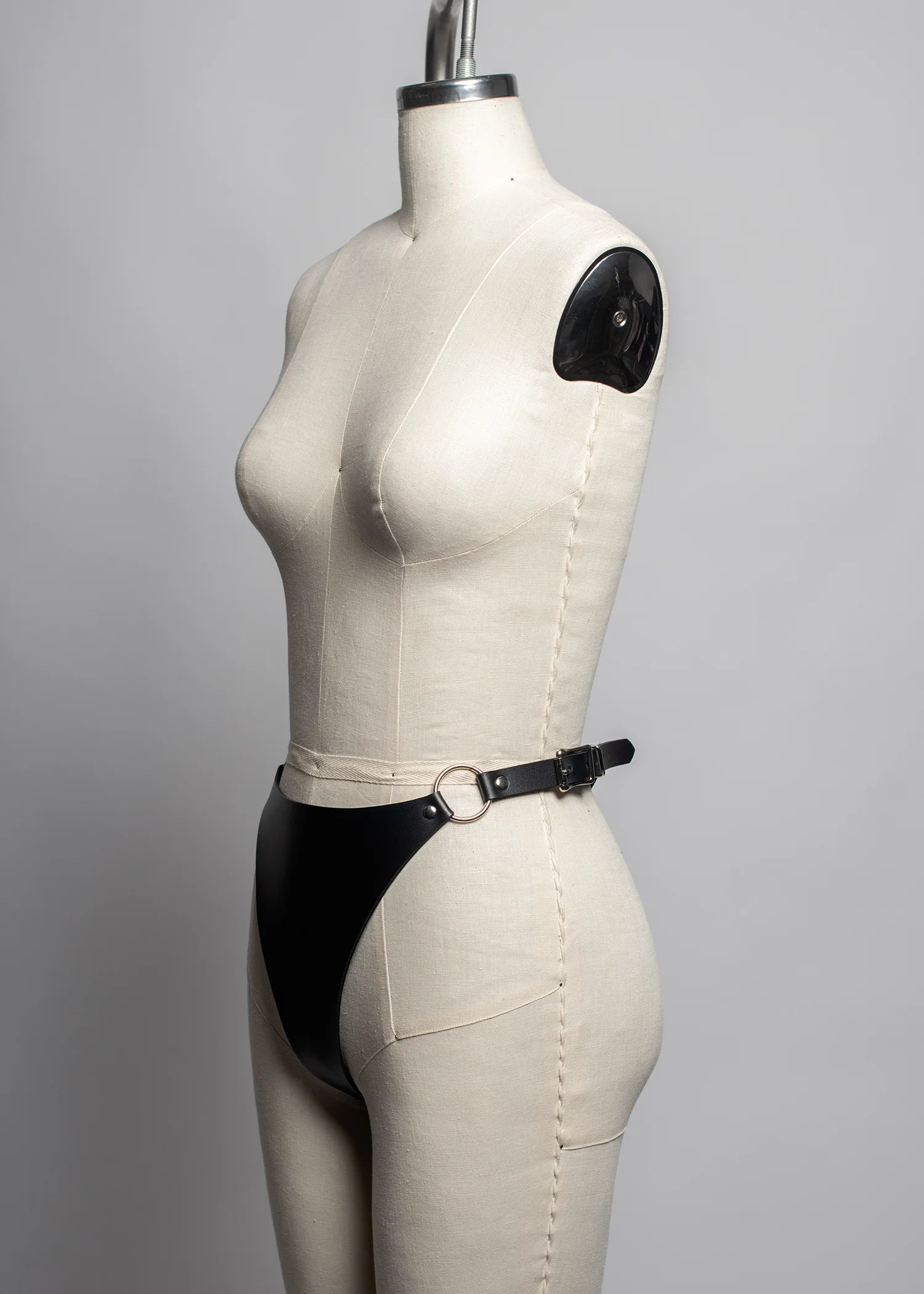 Elegant and sexy harness thong. Buckles at each side of hips. Designed to be worn at the high waist. Wear alone if you're daring or over a bodysuit as a layering piece.