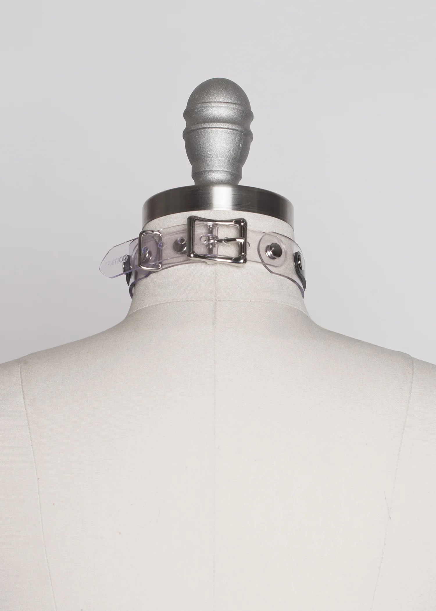 High quality, durable, choker collar made in thick PVC. Black PVC is layered over clear. Fit is adjustable with buckle. Silver-toned nickel plated steel hardware.