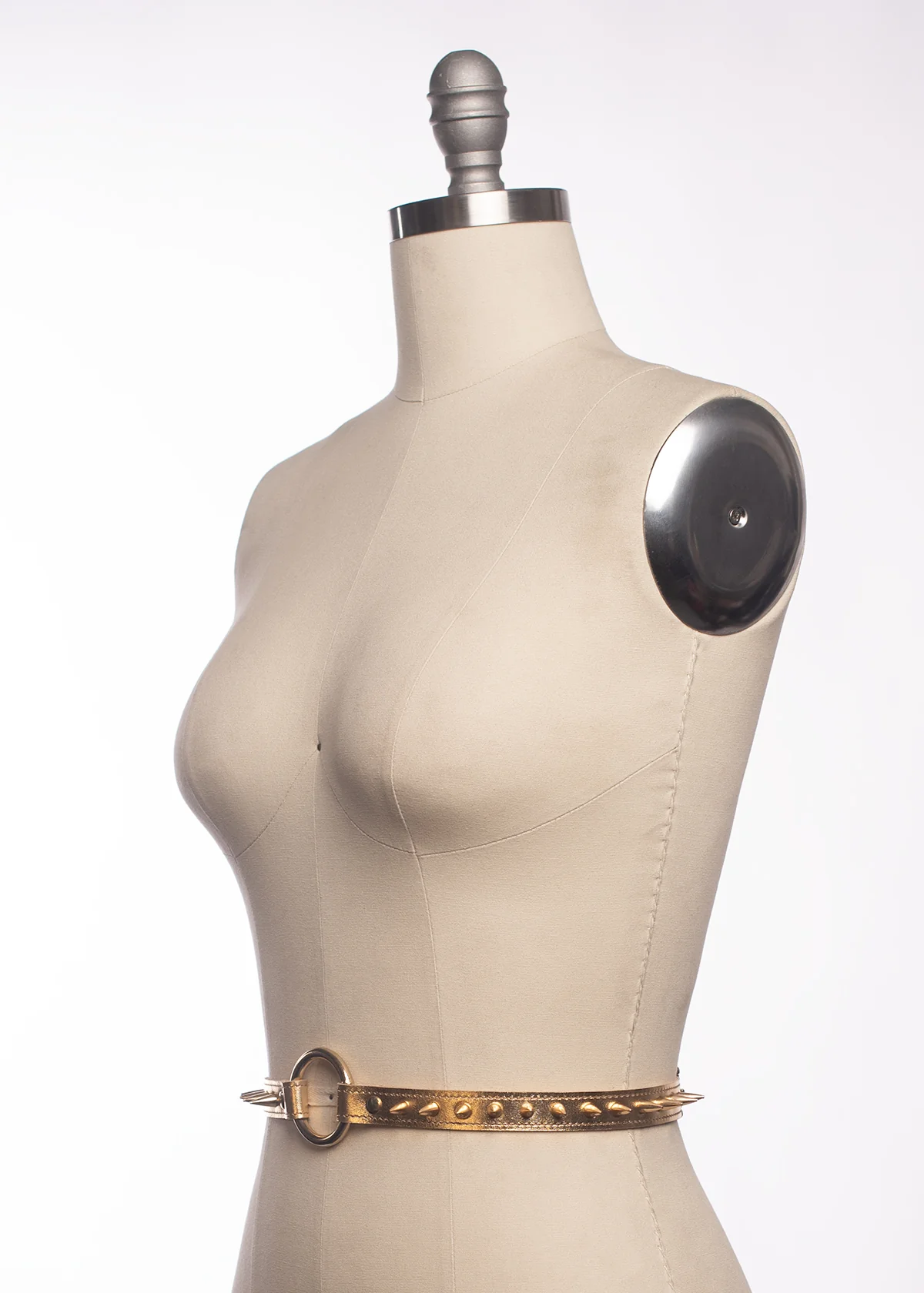 The Spina Belt is a classic belt style with both a punk and glam twist. Luxe metallic leather is lined in soft sueded pigskin and stitched. Matching spikes frame each side of a heavy-duty o-ring. Buckles at the back. Designed and sized to sit at the natural waist. Matching gold or silver toned hardware.Â