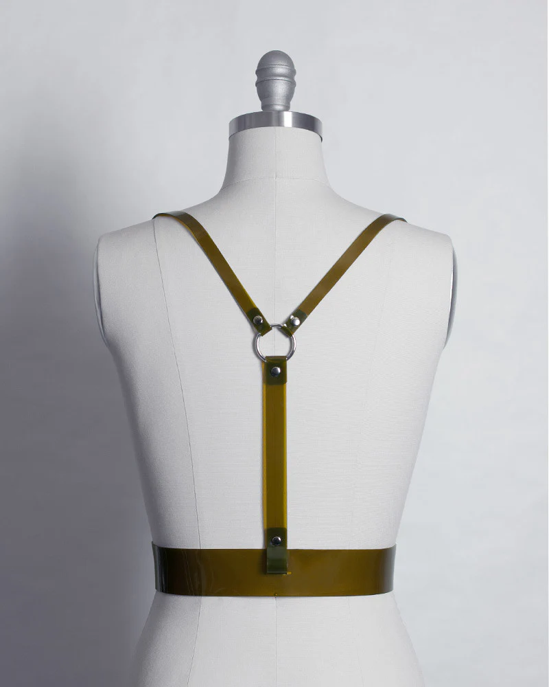 Named for and inspired by the famous cyberpunk character, the Zhora Harness is a versatile wardrobe staple. Fit is adjustable with buckles and straps. Silver-toned nickel plated steel hardware. Skinny shoulder straps connect to large D-rings and a wide belt that sits at the waist. Unisex styling. Great layering piece. Available in both PVC and leather.